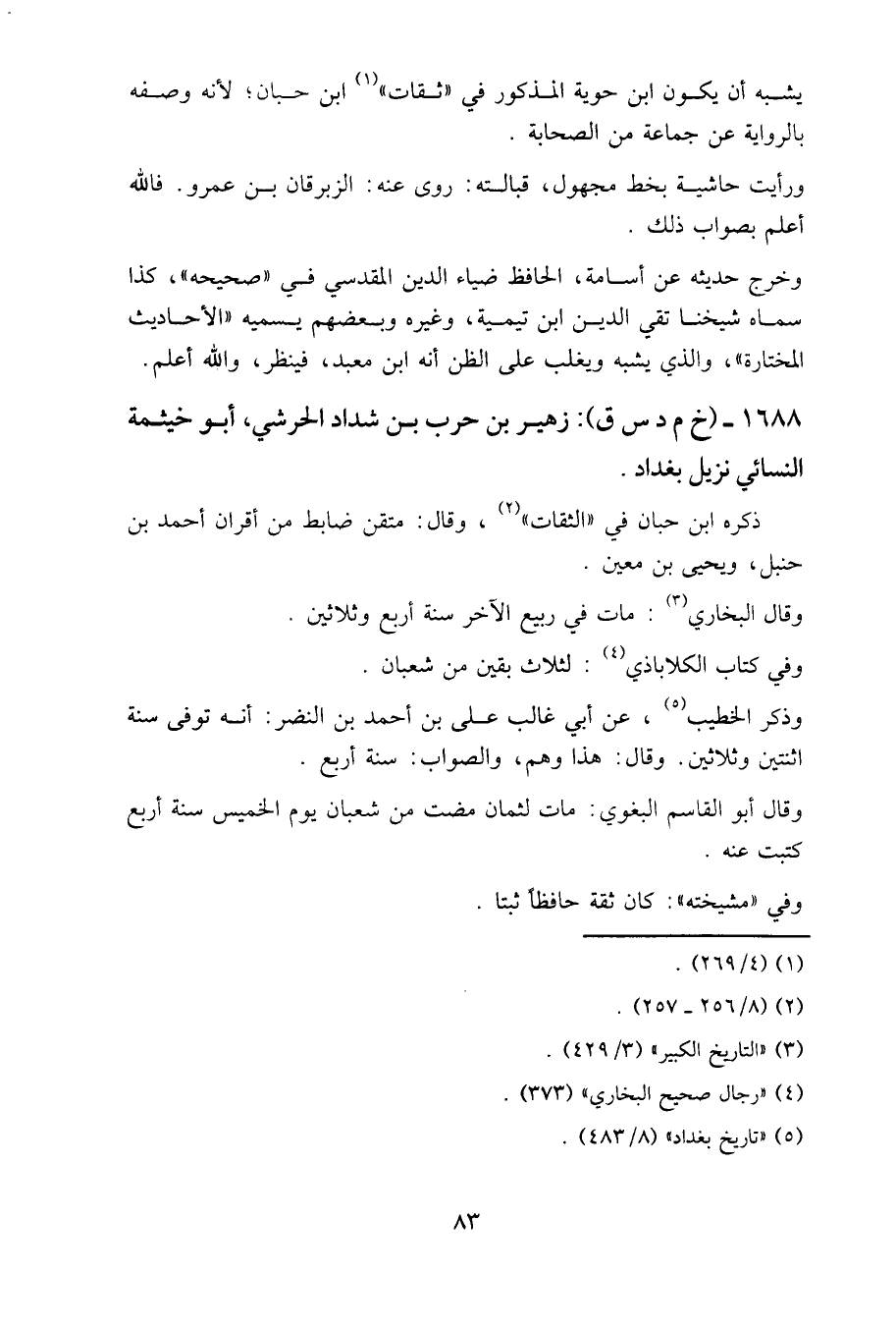 1688 - (خ م د س ق): زهير بن حرب بن شداد الحرشي، أبو خيثمة النسائي نزيل بغداد.
