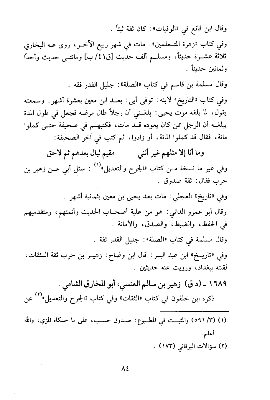 وفي «تاريخ» ابن عبد البر: قال ابن وضاح: زهير بن حرب ثقة الثقات، لقيته ببغداد، ورويت عنه حديثين.