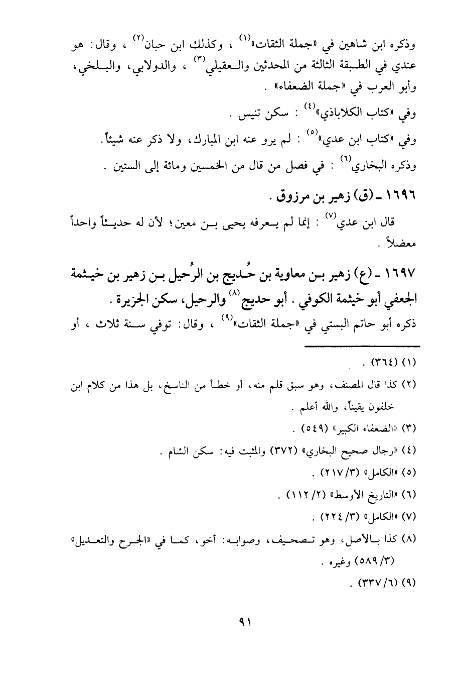 1697 - (ع) زهير بن معاوية بن حديج بن الرحيل بن زهير بن خيثمة الجعفي أبو خيثمة الكوفي. أبو حديج والرحيل، سكن الجزيرة.