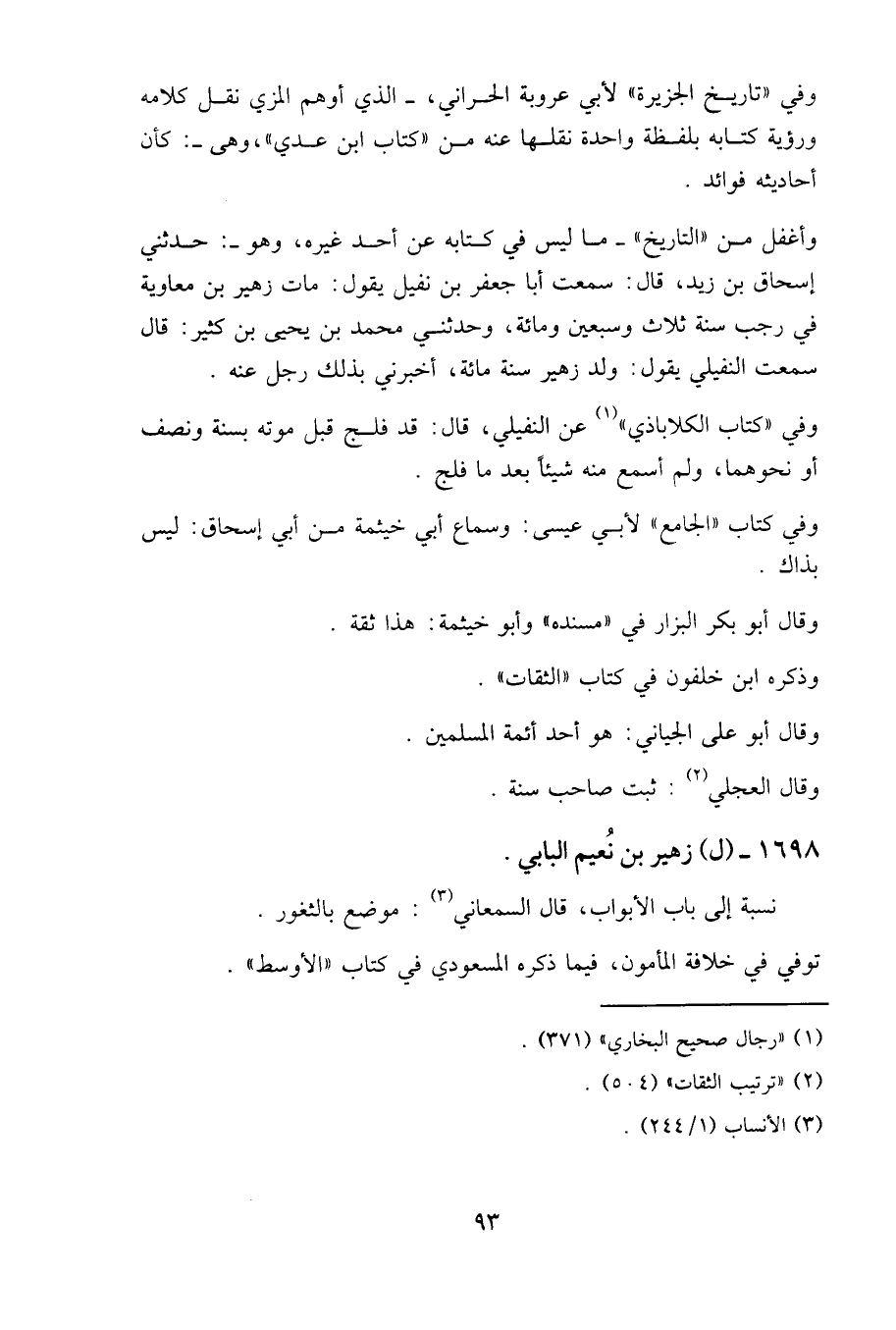 وأغفل من «التاريخ» - ما ليس في كتابه عن أحد غيره، وهو-: حدثني إسحاق بن زيد، قال: سمعت أبا جعفر بن نفيل يقول: مات زهير بن معاوية في رجب سنة ثلاث وسبعين ومائة، وحدثني محمد بن يحيى بن كثير: قال سمعت النفيلي يقول: ولد زهير سنة مائة، أخبرني بذلك رجل عنه.