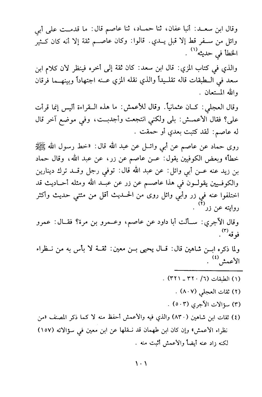 وقال ابن سعد: أنبا عفان، ثنا حماد، ثنا عاصم قال: ما قدمت على أبي وائل من سفر قط إلا قبل يدي. قالوا: وكان عاصم ثقة إلا أنه كان كثير الخطأ في حديثه.