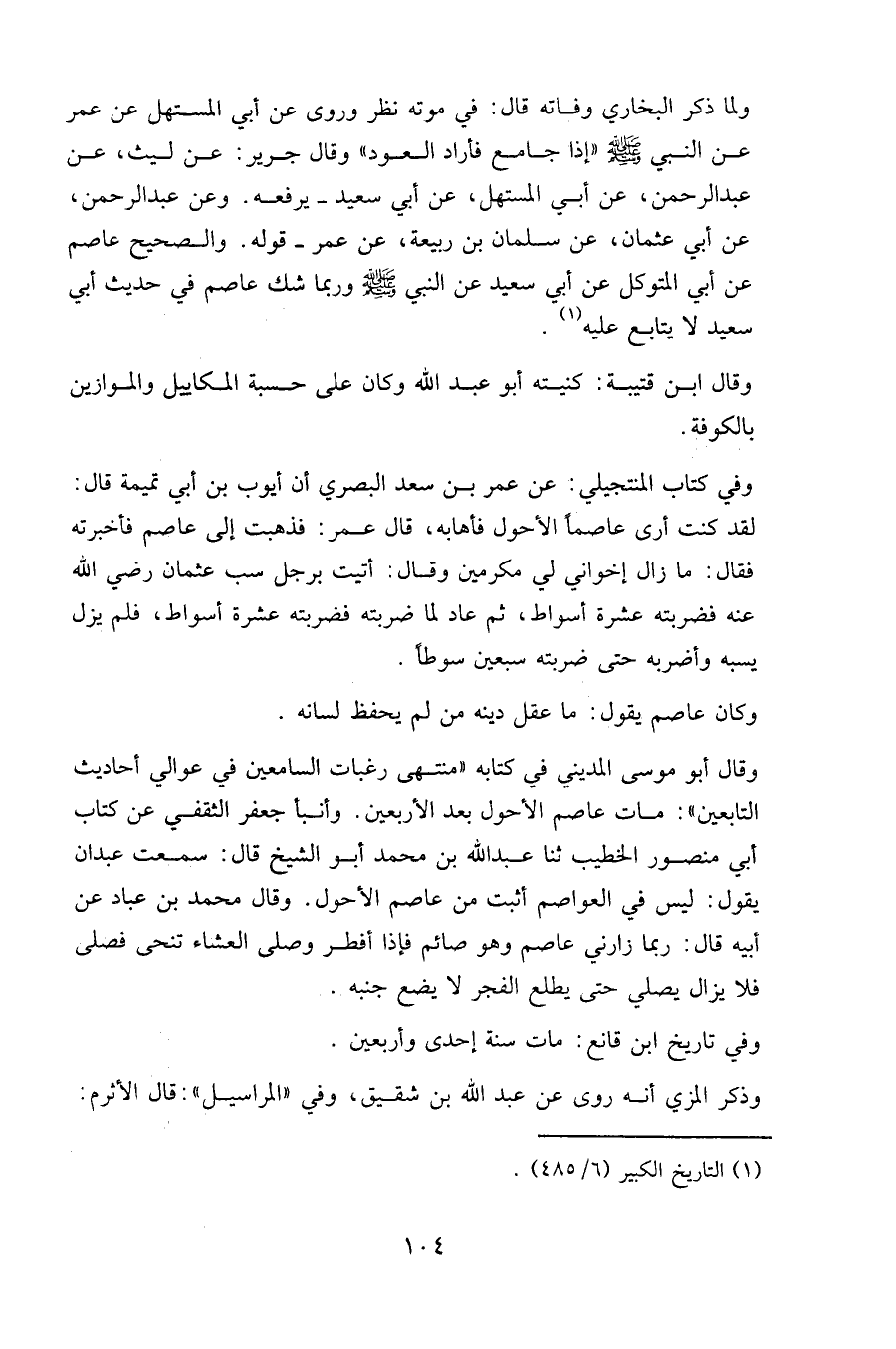 وقال أبو موسى المديني في كتابه " منتهى رغبات السامعين في عوالي أحاديث التابعين ": مات عاصم الأحول بعد الأربعين. وأنبأ جعفر الثقفي عن كتاب أبي منصور الخطيب ثنا عبد الله بن محمد أبو الشيخ قال: سمعت عبدان يقول: ليس في العواصم أثبت من عاصم الأحول. وقال محمد بن عباد عن أبيه قال: ربما زارني عاصم وهو صائم فإذا أفطر وصلى العشاء تنحى فصلى فلا يزال يصلي حتى يطلع الفجر لا يضع جنبه.