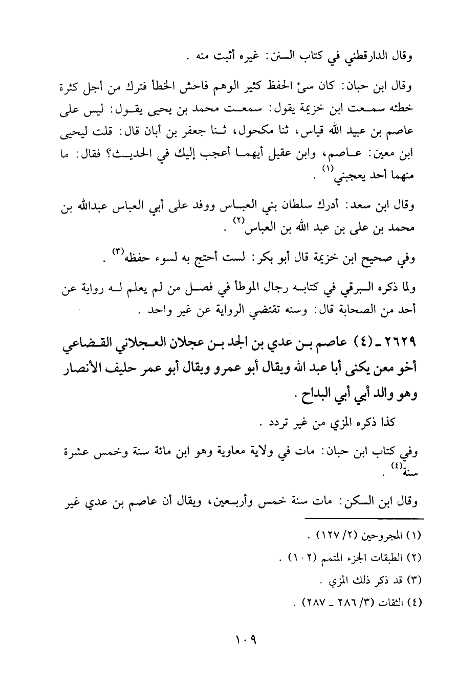 2629 - (4) عاصم بن عدي بن الجد بن عجلان العجلاني القضاعي أخو معن يكنى أبا عبد الله ويقال أبو عمرو وقال أبو عمر حليف الأنصار وهو والد أبي أبي الدحداح.