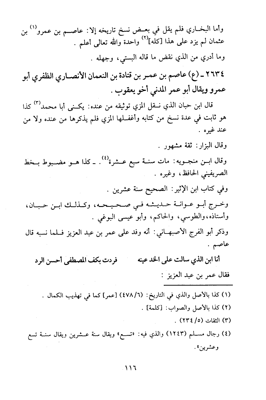 وأما البخاري فلم يقل في بعض نسخ تاريخه إلا: عاصم بن عمرو بن عثمان لم يزد على هذا [كله] واحدة والله تعالى أعلم.