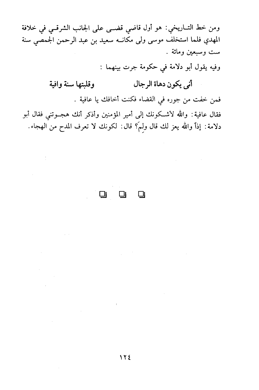 ومن خط التاريخي: هو أول قاض قضى على الجانب الشرقي في خلافة المهدي فلما استخلف موسى ولى مكانه سعيد بن عبد الرحمن الجمصي سنة ست وسبعين ومائة.