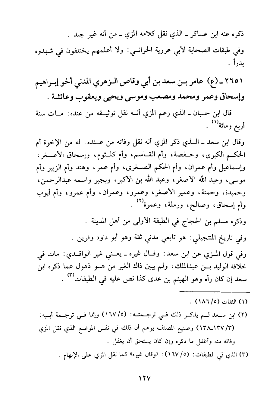 2651 - (ع) عامر بن سعد بن أبي وقاص الزهري المدني أخو إبراهيم وإسحاق وعمر ومحمد ومصعب وموسى ويحيى ويعقوب وعائشة.