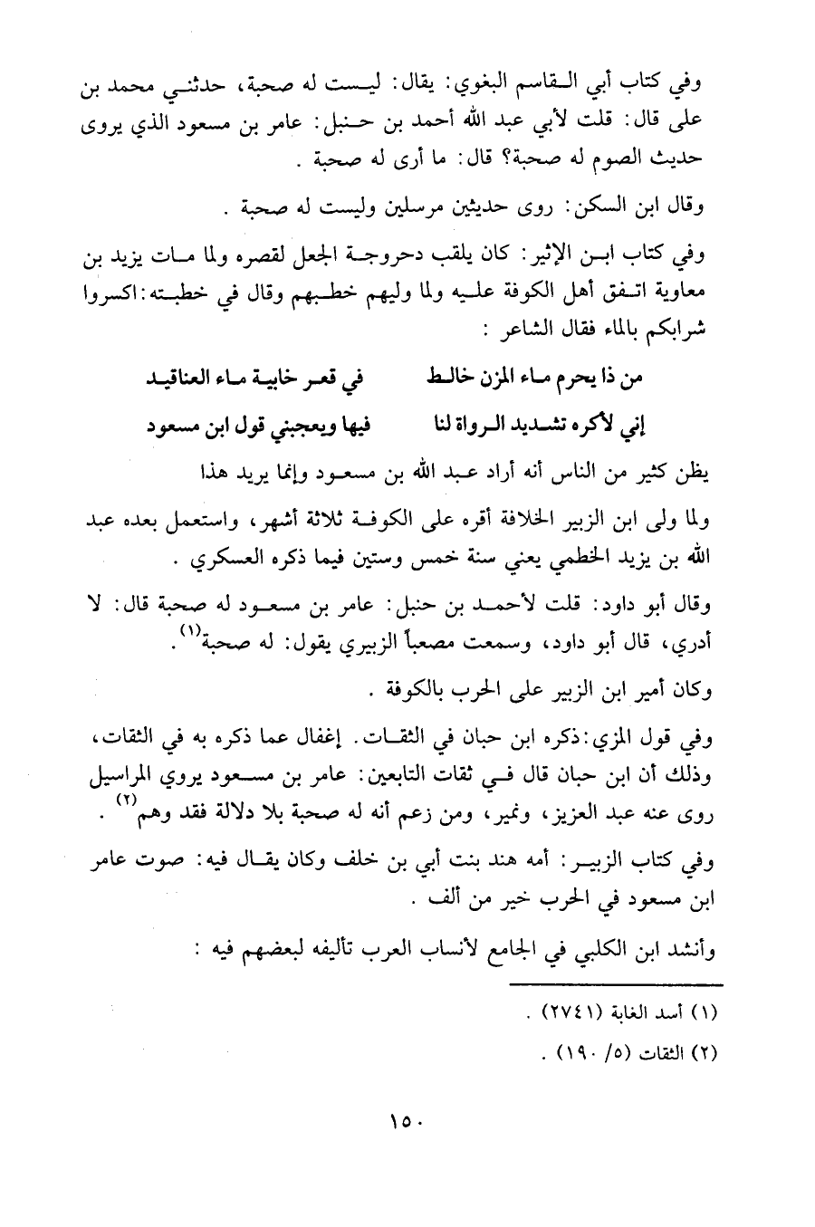وفي كتاب أبي القاسم البغوي: يقال: ليست له صحبة، حدثني محمد بن علي قال: قلت لأبي عبد الله أحمد بن حنبل: عامر بن مسعود الذي يروي حديث الصوم له صحبة؟ قال: ما أرى له صحبة.