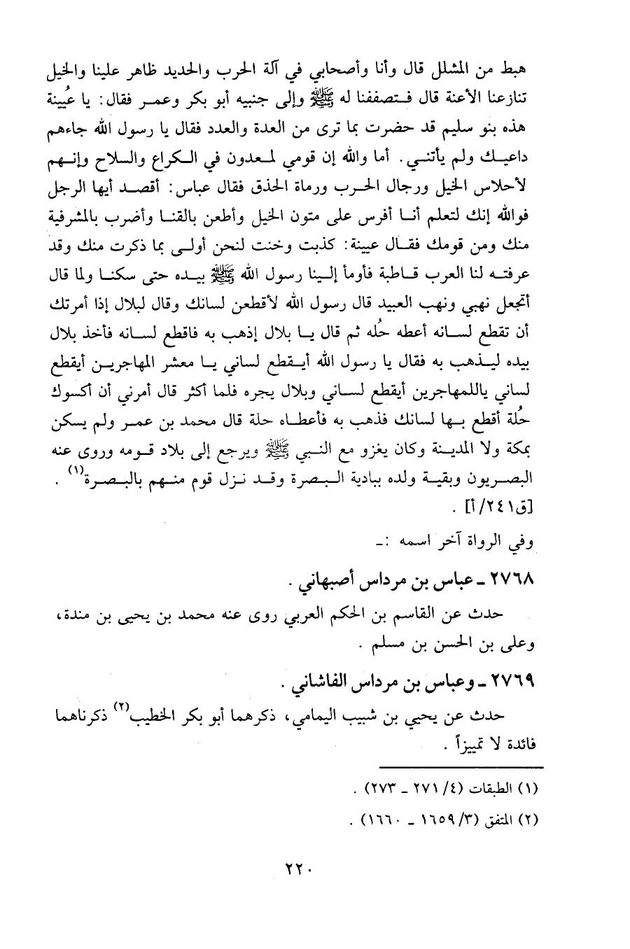 هبط من المشلل قال وأنا وأصحابي في آلة الحرب والحديد ظاهر علينا والخيل تنازعنا الأعنة قال فتصففنا له صلى الله عليه وسلم وإلى جنبيه أبو بكر وعمر فقال: يا عيينة هذه بنو سليم قد حضرت بما ترى من العدة والعدد فقال يا رسول الله جاءهم داعيك ولم يأتني. أما والله إن قومي لمعدون في الكراع والسلاح وإنهم لأحلاس الخيل ورجال الحرب ورماة الحذق فقال عباس: أقصد أيها الرجل فوالله إنك لتعلم أنا أفرس على متون الخيل وأطعن بالقنا وأضرب بالمشرفية منك ومن قومك فقال عيينة: كذبت وخنت لنحن أولى بما ذكرت منك وقد عرفته لنا العرب قاطبة، فأومأ إلينا رسول الله صلى الله عليه وسلم بيده حتى سكنا، ولما قال أتجعل نهبي ونهب العبيد قال رسول الله لأقطعن لسانك وقال لبلال إذا أمرتك أن تقطع لسانه أعطه حلة ثم قال يا بلال اذهب به فاقطع لسانه فأخذ بلال بيده ليذهب به فقال يا رسول الله أيقطع لساني يا معشر المهاجرين أيقطع لساني يا للمهاجرين أيقطع لساني وبلال يجره فلما أكثر قال أمرني أن أكسوك حلة أقطع بها لسانك فذهب به فأعطاه حلة قال محمد بن عمر ولم يسكن بمكة ولا المدينة وكان يغزو مع النبي صلى الله عليه وسلم ويرجع إلى بلاد قومه وروى عنه البصريون وبقية ولده ببادية البصرة وقد نزل قوم منهم بالبصرة [ق241/أ].