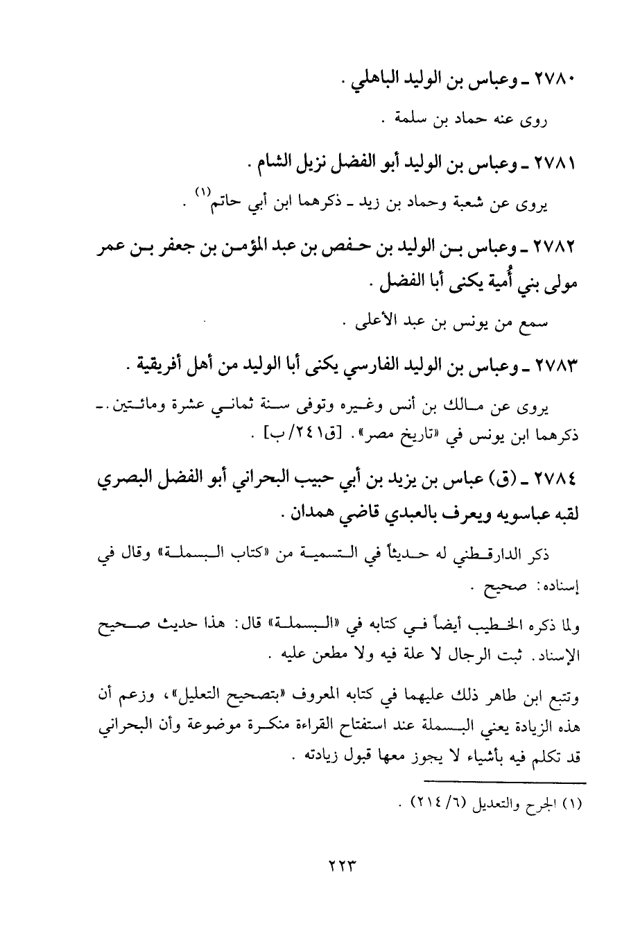 2784 - (ق) عباس بن يزيد بن أبي حبيب البحراني أبو الفضل البصري لقبه عباسويه ويعرف بالعبدي قاضي همدان.