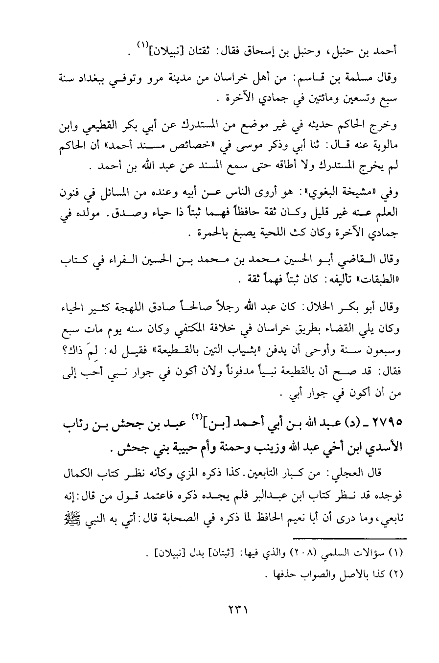 أحمد بن حنبل، وحنبل بن إسحاق فقال: ثقتان [نبيلان].