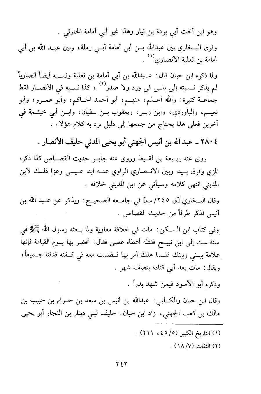 ولما ذكره ابن حبان قال: عبد الله بن أبي أمامة بن ثعلبة ونسبه أيضا أنصاريا لم يذكر نسبته إلى بلى في ورد ولا صدر، كذا نسبه في الأنصار فقط جماعة كثيرة: والله أعلم، منهم، أبو أحمد الحاكم، وأبو عمرو، وأبو نعيم، والباوردي، وابن زبر، ويعقوب بن سفيان، وابن أبي خيثمة في آخرين فعلى هذا يحتاج من جمعها إلى دليل يرد به كلام هؤلاء.