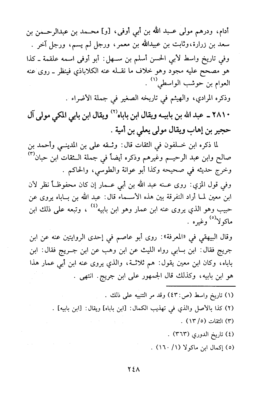 وفي قول المزي: روى عنه عبد الله بن أبي عمار إن كان محفوظا نظر لأن ابن معين لما أراد التفرقة بين هذه الأسماء قال: عبد الله بن باباه يروي عن حبيب وهو الذي يروي عنه ابن عمار وهو ابن بابيه، وتبعه على ذلك ابن ماكولا وغيره.