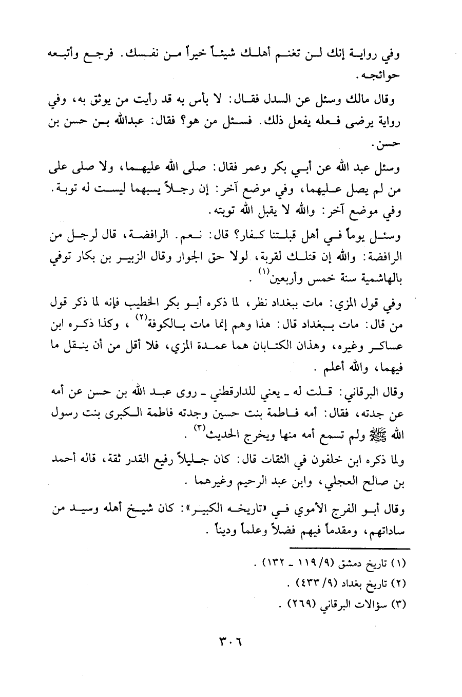 وقال البرقاني: قلت له - يعني للدارقطني - روى عبد الله بن حسن عن أمه عن جدته، فقال: أمه فاطمة بنت حسين وجدته فاطمة الكبرى بنت رسول الله صلى الله عليه وسلم ولم تسمع أمه منها ويخرج الحديث.