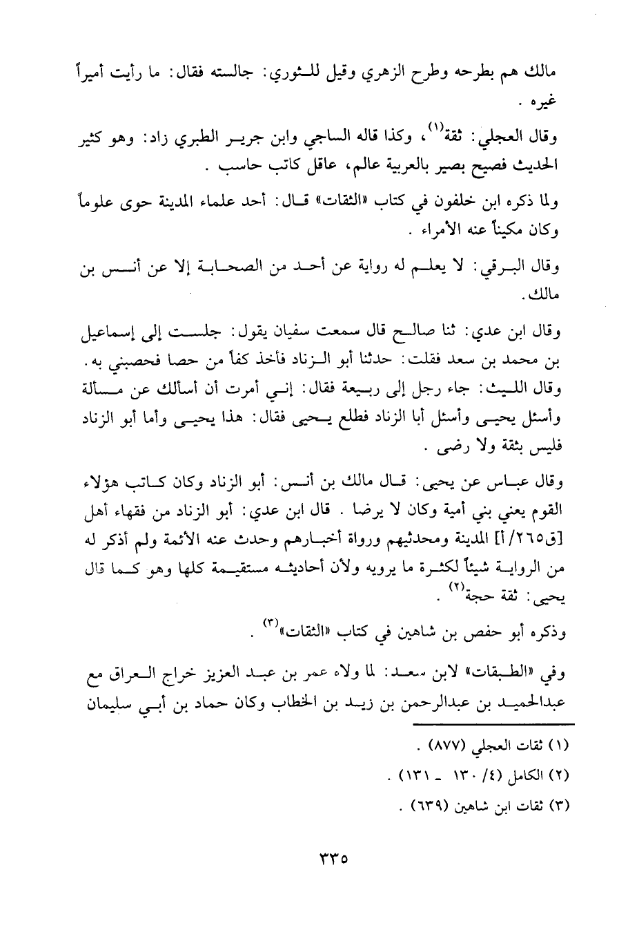وقال عباس عن يحيى: قال مالك بن أنس: أبو الزناد وكان كاتب هؤلاء القوم يعني بني أمية وكان لا يرضى. قال ابن عدي: أبو الزناد من فقهاء أهل [ق 265/أ] المدينة ومحدثيهم ورواة أخبارهم، وحدث عنه الأئمة ولم أذكر له من الرواية شيئا لكثرة ما يرويه؛ ولأن أحاديثه مستقيمة كلها وهو كما قال يحيى: ثقة حجة.