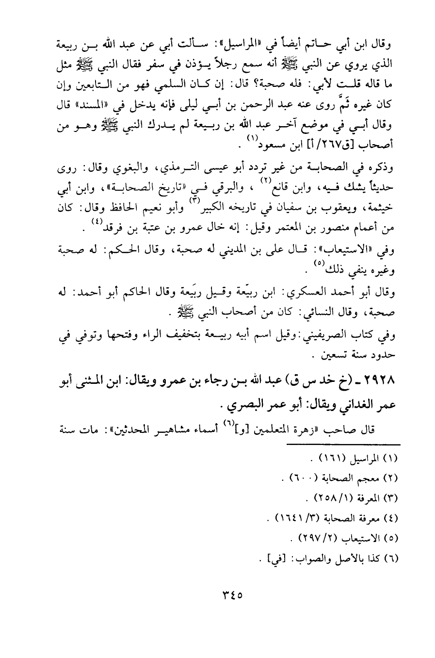 وقال ابن أبي حاتم أيضا في " المراسيل ": سألت أبي عن عبد الله بن ربيعة الذي يروي عن النبي صلى الله عليه وسلم أنه سمع رجلا يؤذن في سفر فقال النبي صلى الله عليه وسلم مثل ما قاله قلت لأبي: فله صحبة؟ قال: إن كان السلمي فهو من التابعين وإن كان غيره ثم روى عنه عبد الرحمن بن أبي ليلى فإنه يدخل في " المسند " قال وقال أبي في موضع آخر عبد الله بن ربيعة لم يدرك النبي صلى الله عليه وسلم وهو من أصحاب [ق 267/أ] ابن مسعود.