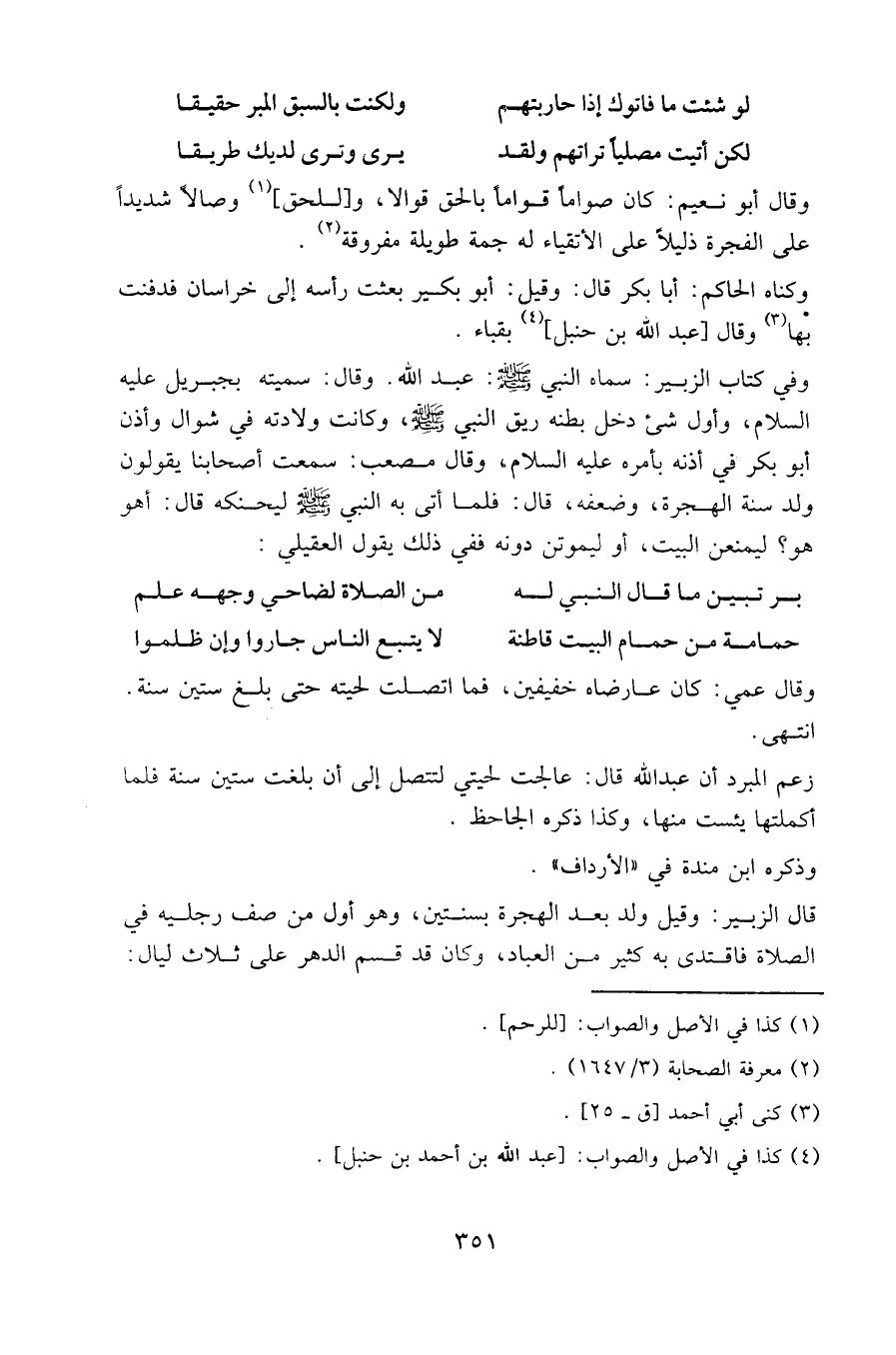 وفي كتاب الزبير: سماه النبي صلى الله عليه وسلم: عبد الله. وقال: سميته بجبريل عليه السلام، وأول شيء دخل بطنه ريق النبي صلى الله عليه وسلم، وكانت ولادته في شوال، وأذن أبو بكر في أذنه بأمره عليه السلام، وقال مصعب: سمعت أصحابنا يقولون ولد سنة الهجرة، وضعفه، قال: فلما أتى به النبي صلى الله عليه وسلم ليحكنه قال: أهو هو؟ ليمنعن البيت، أو ليموتن دونه ففي ذلك يقول العقيلي: