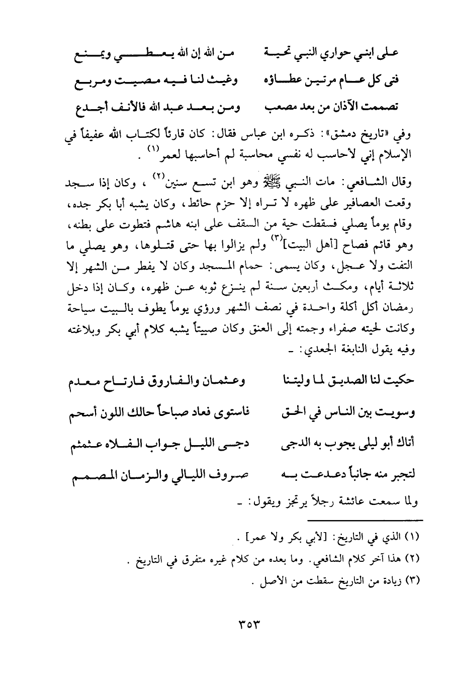 وقال الشافعي: مات النبي صلى الله عليه وسلم وهو ابن تسع سنين، وكان إذا سجد وقعت العصافير على ظهره لا تراه إلا حزم حائط، وكان يشبه أبا بكر جده، وقام يوما يصلي فسقطت حية من السقف على ابنه هاشم فتطوت على بطنه، وهو قائم فصاح [أهل البيت] ولم يزالوا بها حتى قتلوها، وهو يصلي ما التفت ولا عجل، وكان يسمى: حمام المسجد وكان لا يفطر من الشهر إلا ثلاثة أيام، ومكث أربعين سنة لم ينزع ثوبه عن ظهره، وكان إذا دخل رمضان أكل أكلة واحدة في نصف الشهر، ورؤي يوما يطوف بالبيت سياحة وكانت لحيته صفراء وجمته إلى العنق وكان صييتا يشبه كلام أبي بكر وبلاغته، وفيه يقول النابغة الجعدي: