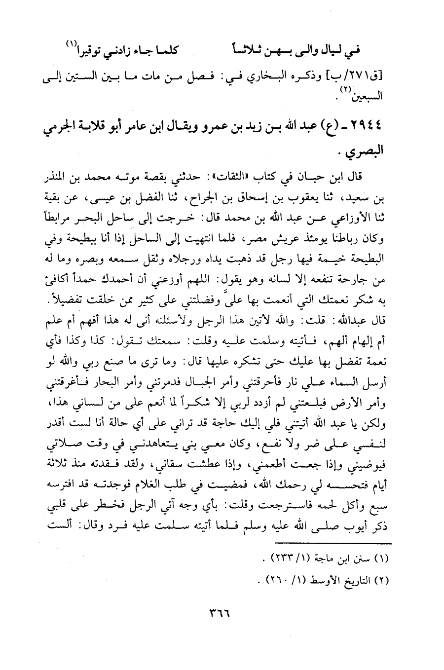 قال ابن حبان في كتاب " الثقات ": حدثني بقصة موته محمد بن المنذر بن سعيد، ثنا يعقوب بن إسحاق بن الجراح، ثنا الفضل بن عيسى، عن بقية ثنا الأوزاعي عن عبد الله بن محمد قال: خرجت إلى ساحل البحر مرابطا وكان رباطنا يومئذ عريش مصر، فلما انتهيت إلى الساحل إذا أنا ببطيحة وفي البطيحة خيمة فيها رجل قد ذهبت يداه ورجلاه وثقل سمعه وبصره وما له من جارحة تنفعه إلا لسانه وهو يقول: اللهم أوزعني أن أحمدك حمدا أكافئ به شكر نعمتك التي أنعمت بها علي وفضلتني على كثير ممن خلقت تفضيلا.