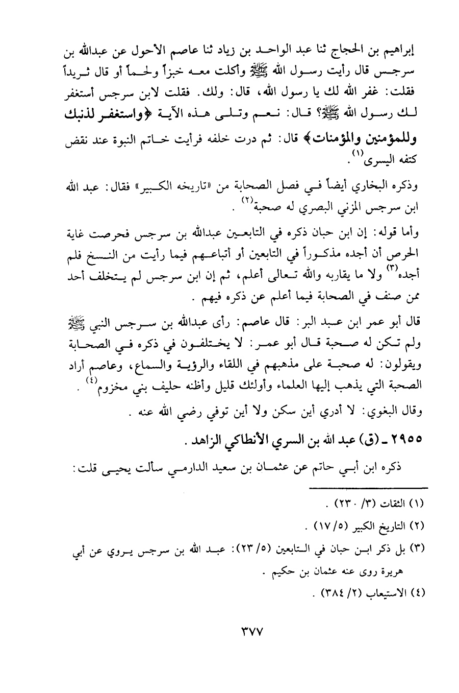 وأما قوله: إن ابن حبان ذكره في التابعين عبد الله بن سرجس فحرصت غاية الحرص أن أجده مذكورا في التابعين أو أتباعهم فيما رأيت من النسخ فلم أجده ولا ما يقاربه والله تعالى أعلم، ثم إن ابن سرجس لم يتخلف أحد ممن صنف في الصحابة فيما أعلم عن ذكره فيهم.