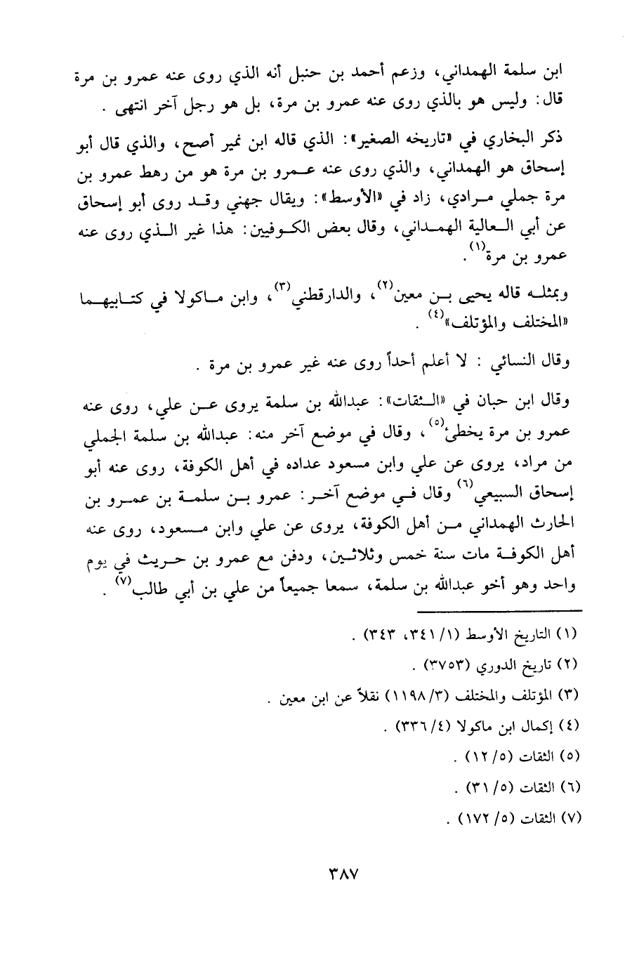 وقال ابن حبان في " الثقات ": عبد الله بن سلمة يروي عن علي، روى عنه عمرو بن مرة يخطئ، وقال في موضع آخر منه: عبد الله بن سلمة الجملي من مراد، يروي عن علي وابن مسعود عداده في أهل الكوفة، روى عنه أبو إسحاق السبيعي وقال في موضع آخر: عمرو بن سلمة بن عمرو بن الحارث الهمداني من أهل الكوفة، يروي عن علي وابن مسعود، روى عنه أهل الكوفة مات سنة خمس وثلاثين، ودفن مع عمرو بن حريث في يوم واحد وهو أخو عبد الله بن سلمة، سمعا جميعا من علي بن أبي طالب.