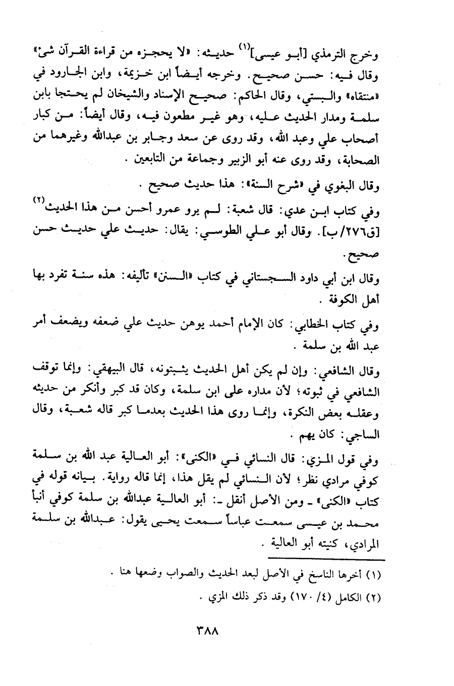 وفي قول المزي: قال النسائي في " الكنى ": أبو العالية عبد الله بن سلمة كوفي مرادي نظر؛ لأن النسائي لم يقل هذا، إنما قاله رواية. بيانه قوله في كتاب " الكنى " - ومن الأصل أنقل -: أبو العالية عبد الله بن سلمة كوفي أنبأ محمد بن عيسى سمعت عباسا سمعت يحيى يقول: عبد الله بن سلمة المرادي، كنيته أبو العالية.