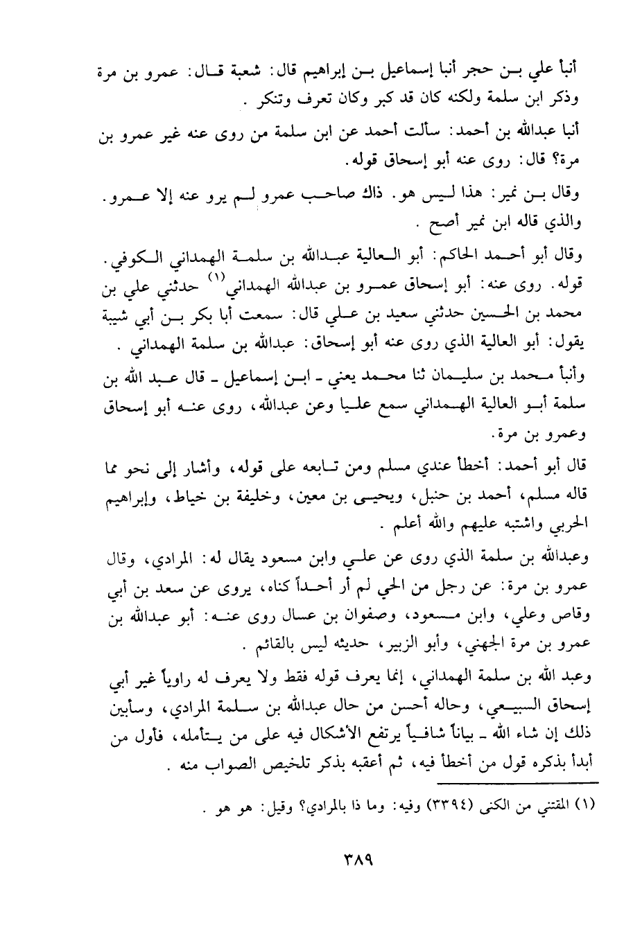 وعبد الله بن سلمة الهمداني، إنما يعرف قوله فقط ولا يعرف له راويا غير أبي إسحاق السبيعي، وحاله أحسن من حال عبد الله بن سلمة المرادي، وسأبين ذلك إن شاء الله - بيانا شافيا يرتفع الإشكال فيه على من يتأمله، فأول من أبدأ بذكره قول من أخطأ فيه، ثم أعقبه بذكر تلخيص الصواب منه.