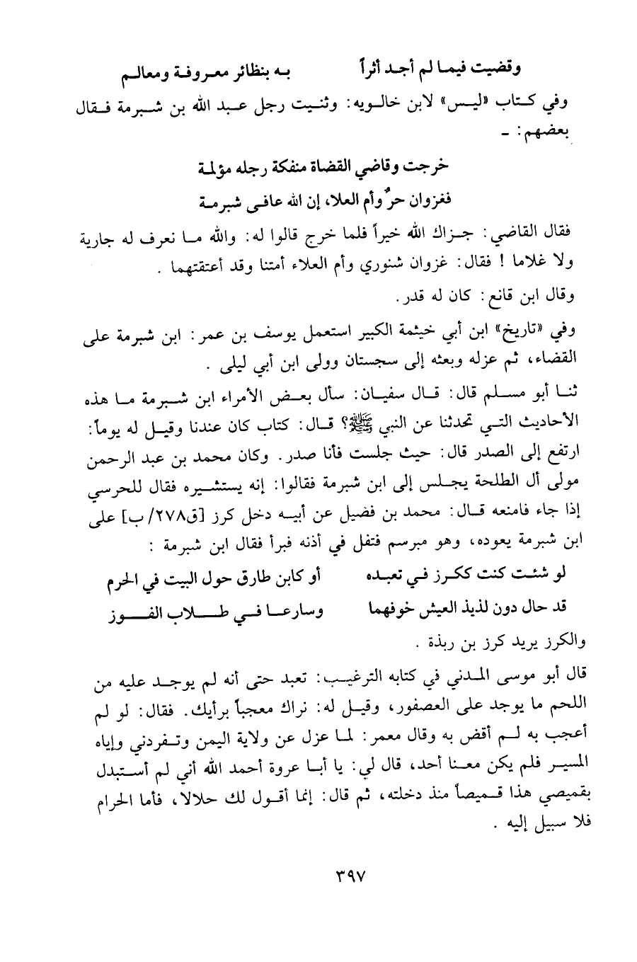 خرجت وقاضي القضاة منفكة رجله مؤلمة ... فغزوان حر وأم العلا، إن الله عافى شبرمة