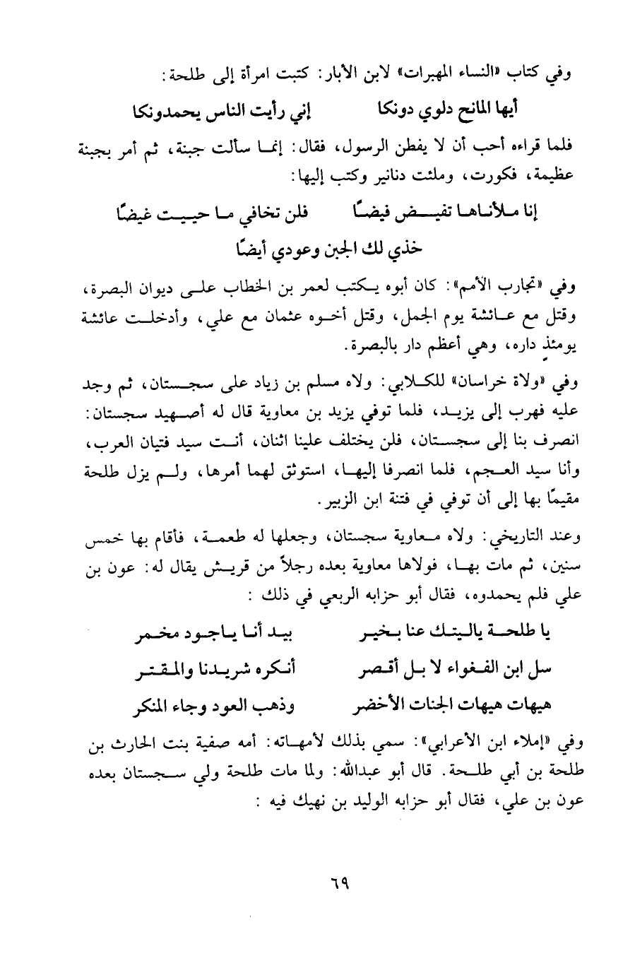 وفي كتاب " النساء المهبرات " لابن الأبار: كتبت امرأة إلى طلحة: