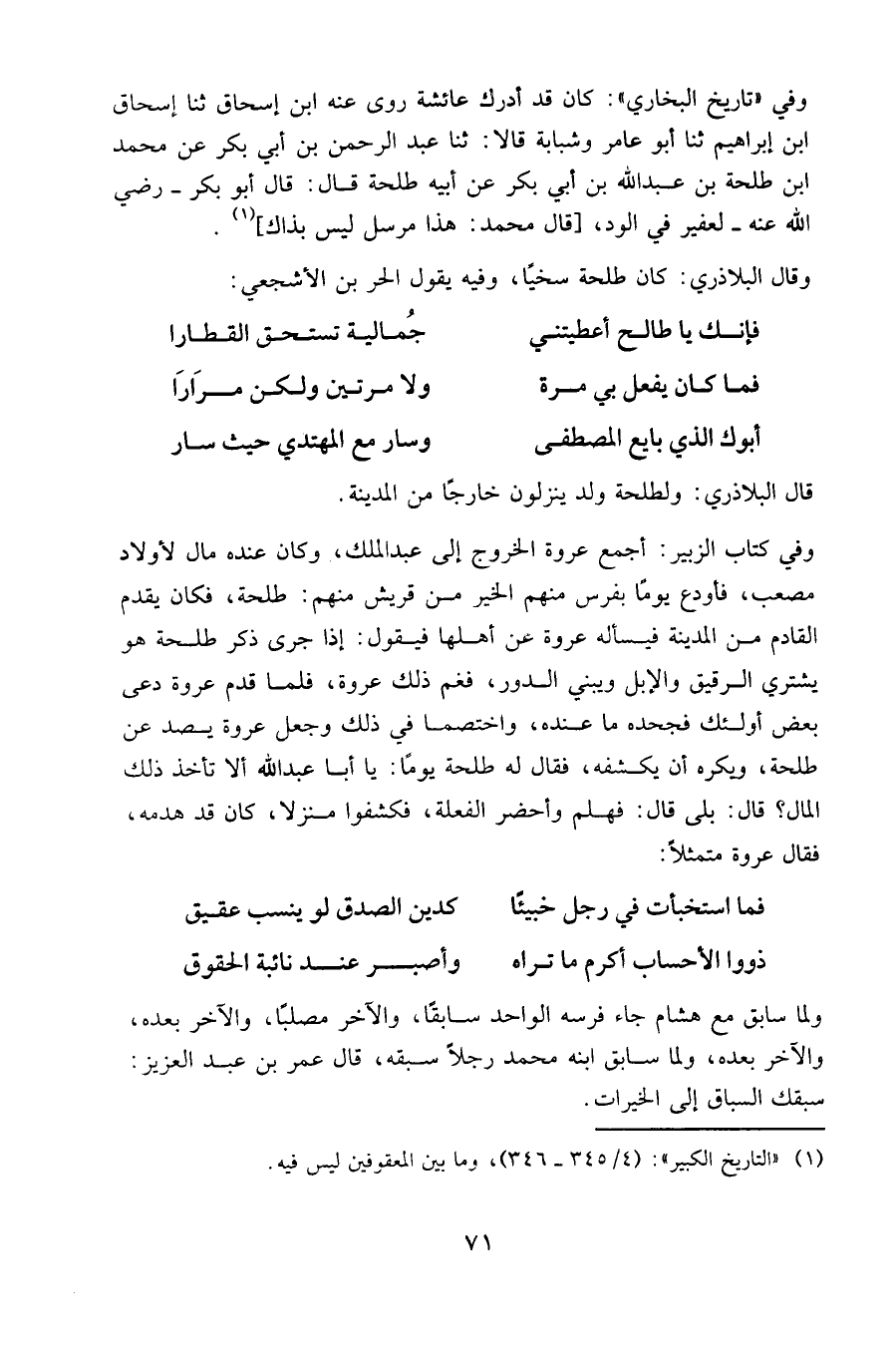 وقال البلاذري: كان طلحة سخيا، وفيه يقول الحر بن الأشجعي:
