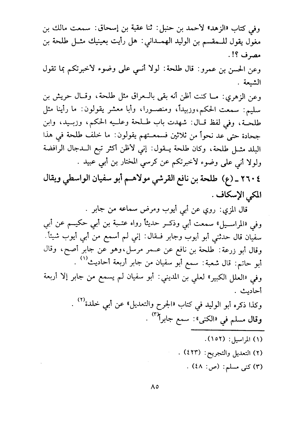 وقال أبو زرعة: طلحة بن نافع عن عمر مرسل، وهو عن جابر أصح، وقال أبو حاتم: قال شعبة: سمع أبو سفيان من جابر أربعة أحاديث.