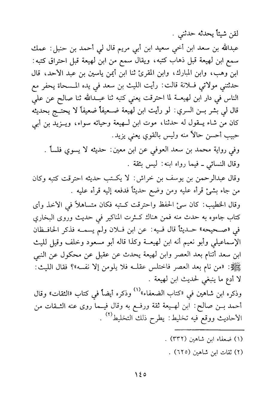 عبد الله بن سعد ابن أخي سعيد ابن أبي مريم قال لي أحمد بن حنبل: عمك سمع ابن لهيعة قبل ذهاب كتبه، ويقال سمع من ابن لهيعة قبل احتراق كتبه: ابن وهب، وابن المبارك، وابن المقرئ ثنا ابن أيمن ياسين بن عبد الأحد، قال حدثتني مولاتي فلانة قالت: رأيت الليث بن سعد في يده المسحاة يحفر مع الناس في دار ابن لهيعة لما احترقت يعني كتبه ثنا عبد الله ثنا صالح عن علي قال لي بشر بن السري: لو رأيت ابن لهيعة ضعيفا ضعيفا لا يحتج بحديثه كان من شاء يقول له حدثنا، موت ابن لهيعة وحياته سواء، ويزيد بن أبي حبيب أحسن حالا منه وليس بالقوي يعني يزيد.
