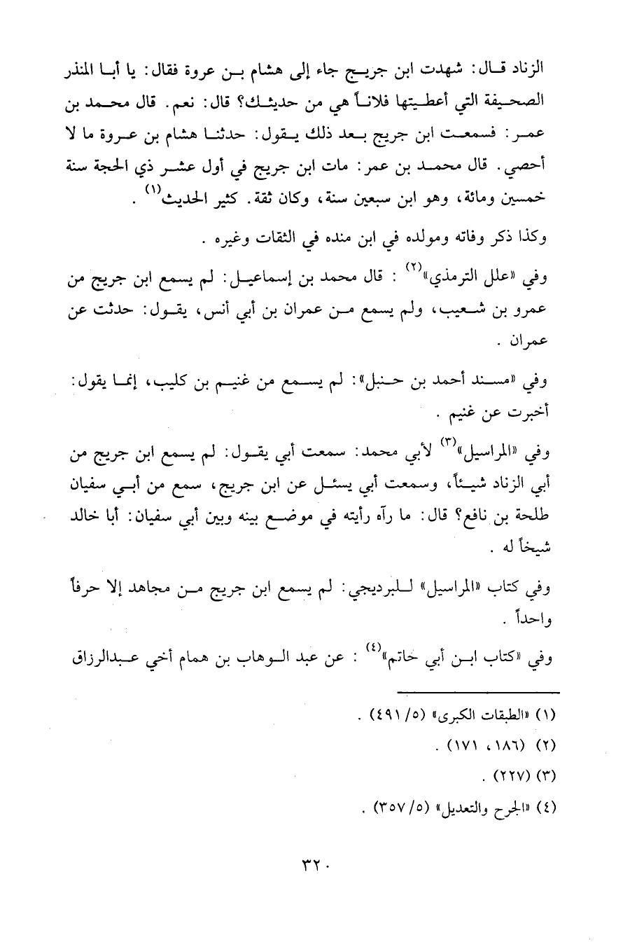 وفي " المراسيل " لأبي محمد: سمعت أبي يقول: لم يسمع ابن جريج من أبي الزناد شيئا، وسمعت أبي يسأل عن ابن جريج، سمع من أبي سفيان طلحة بن نافع؟ قال: ما رآه رأيته في موضع بينه وبين أبي سفيان: أبا خالد شيخا له.
