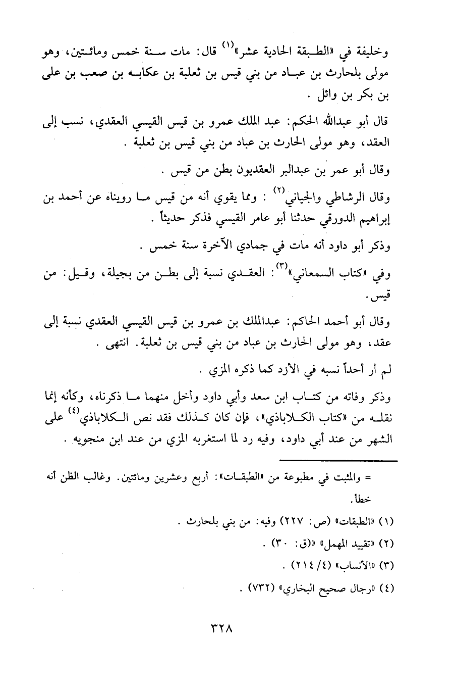 وخليفة في " الطبقة الحادية عشر " قال: مات سنة خمس ومائتين، وهو مولى بلحارث بن عباد من بني قيس بن ثعلبة بن عكابه بن صعب بن علي بن بكر بن وائل.