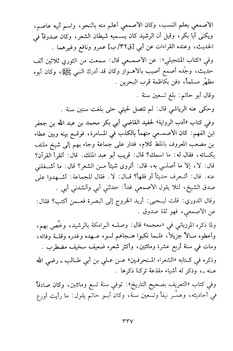 الأصمعي بعلم النسب، وكان الأصمعي أعلم منه بالنحو، واسم أبيه عاصم، ويكنى أبا بكر، وقيل أن الرشيد كان يسميه شيطان الشعر، وكان صدوقا في الحديث، وعنده القراءات عن أبي [ق32/ب] عمرو ونافع وغيرهما.