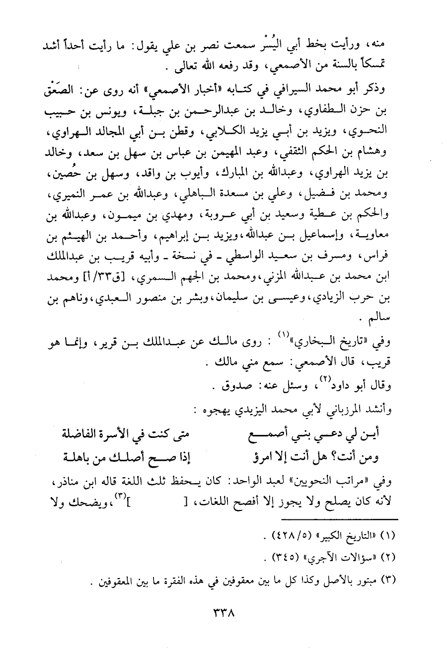 وذكر أبو محمد السيرافي في كتابه " أخبار الأصمعي " أنه روى عن: الصعق بن حزن الطفاوي، وخالد بن عبد الرحمن بن جبلة، ويونس بن حبيب النحوي، ويزيد بن أبي يزيد الكلابي، وقطن بن أبي المجالد الهراوي، وهشام بن الحكم الثقفي، وعبد المهيمن بن عباس بن سهل بن سعد، وخالد بن يزيد الهراوي، وعبد الله بن المبارك، وأيوب بن واقد، وسهل بن حصين، ومحمد بن فضيل، وعلي بن مسعدة الباهلي، وعبد الله بن عمر النميري، والحكم بن عطية وسعيد بن أبي عروبة، ومهدي بن ميمون، وعبد الله بن معاوية، وإسماعيل بن عبد الله، ويزيد بن إبراهيم، وأحمد بن الهيثم بن فراس، ومسرف بن سعيد الواسطي - في نسخة - وأبيه قريب بن عبد الملك بن محمد بن عبد الله المزني، ومحمد بن الجهم السمري، [ق33/أ] ومحمد بن حرب الزيادي، وعيسى بن سليمان، وبشر بن منصور العبدي، وناهم بن سالم.