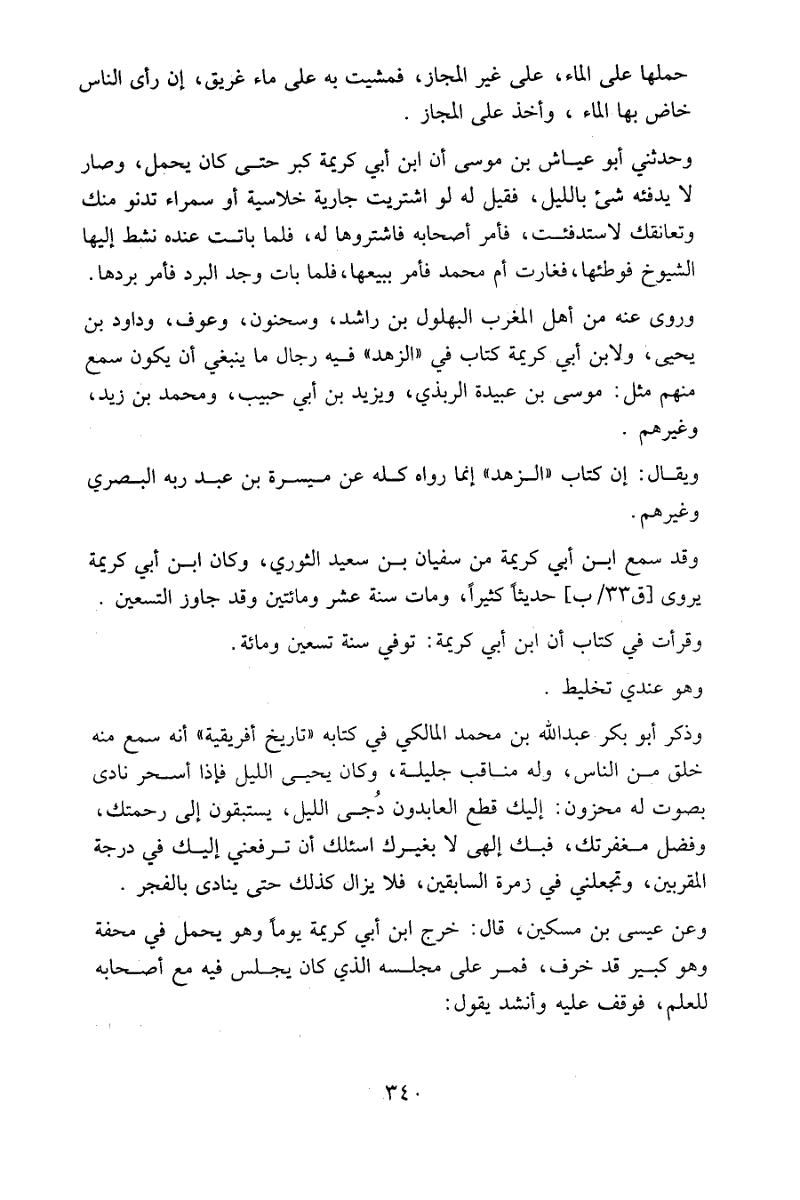 وقد سمع ابن أبي كريمة من سفيان بن سعيد الثوري، وكان ابن أبي كريمة يروي [ق33/ب] حديثا كثيرا، ومات سنة عشر ومائتين وقد جاوز التسعين.