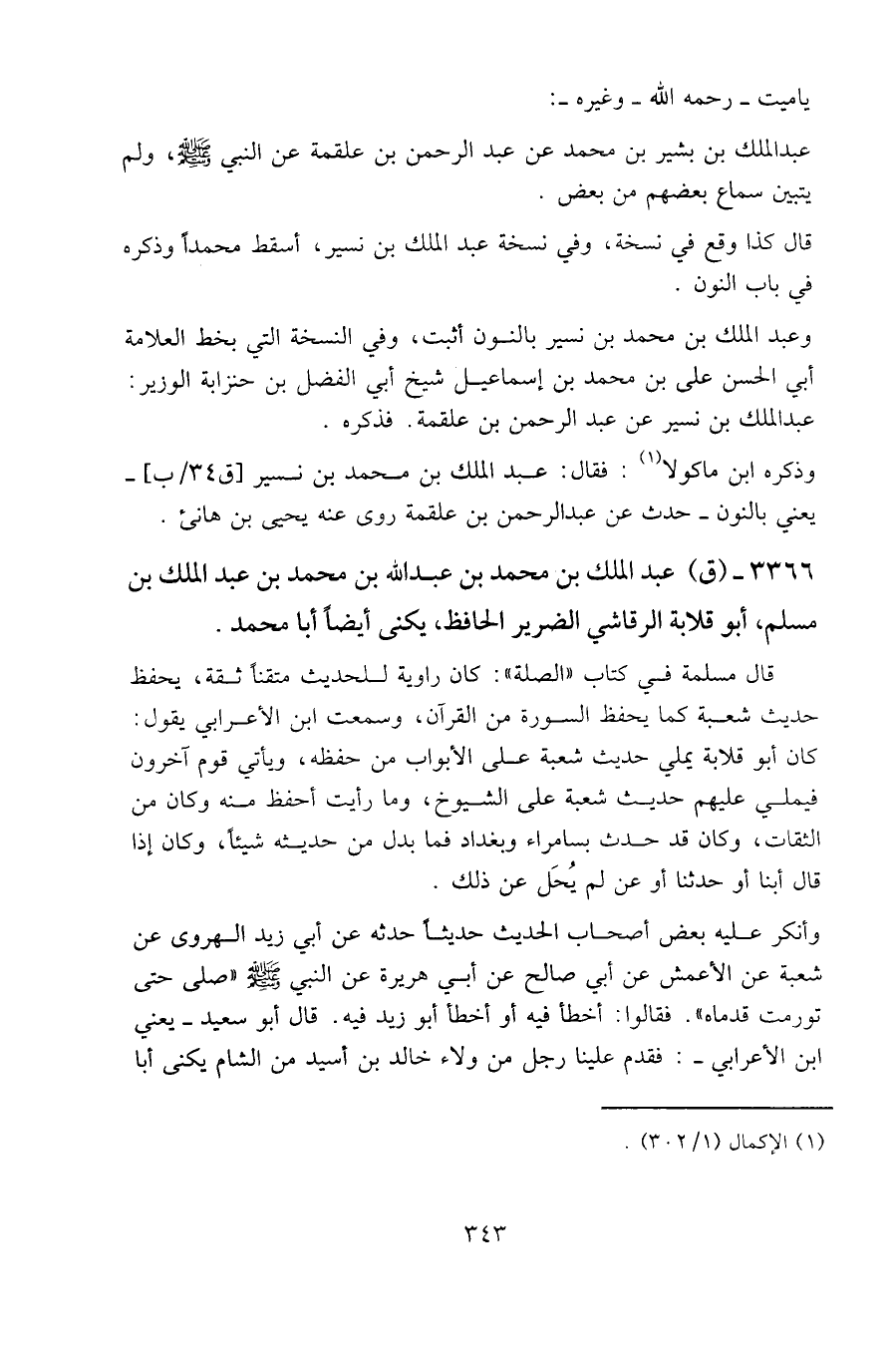 وعبد الملك بن محمد بن نسير بالنون أثبت، وفي النسخة التي بخط العلامة أبي الحسن علي بن محمد بن إسماعيل شيخ أبي الفضل بن حنزابة الوزير: عبد الملك بن نسير عن عبد الرحمن بن علقمة. فذكره.