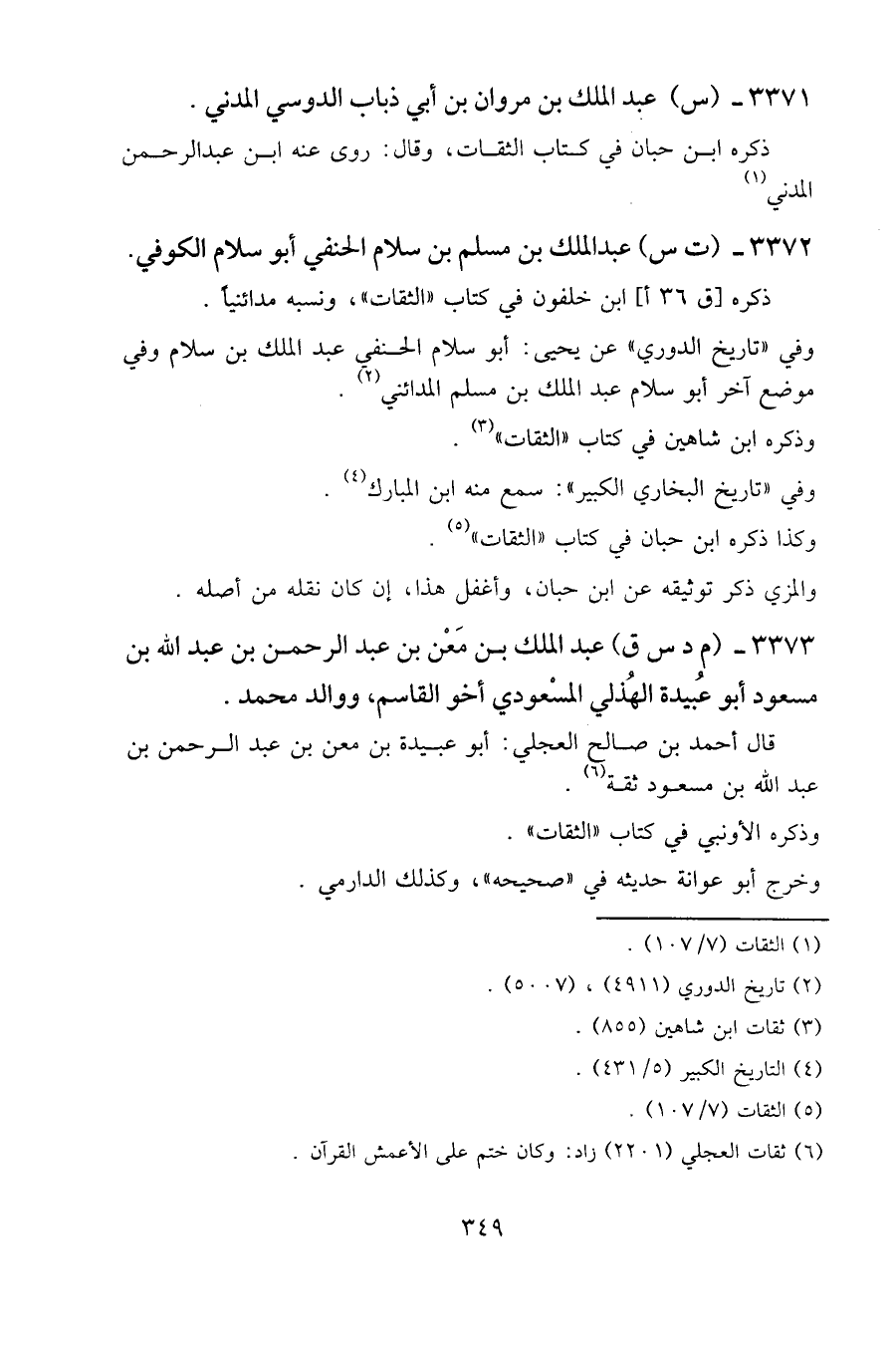 3373 - (م د س ق) عبد الملك بن معن بن عبد الرحمن بن عبد الله بن مسعود أبو عبيدة الهذلي المسعودي أخو القاسم، ووالد محمد.