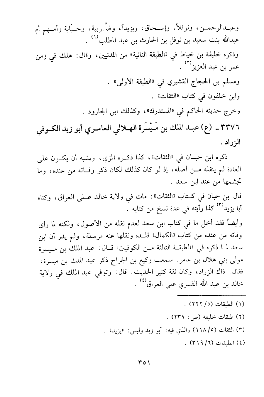 وأيضا فقد أخل ما في كتاب ابن سعد لعدم نقله من الأصول، ولكنه لما رأى وفاته من عنده من كتاب " الكمال " قلده ونقلها عنه مرسلة، ولم يدر أن ابن سعد لما ذكره في " الطبقة الثالثة من الكوفيين " قال: عبد الملك بن ميسرة مولى بني هلال بن عامر. سمعت وكيع بن الجراح ذكر عبد الملك بن ميسرة، فقال: ذاك الزراد، وكان ثقة كثير الحديث. قال: وتوفي عبد الملك في ولاية خالد بن عبد الله القسري على العراق.