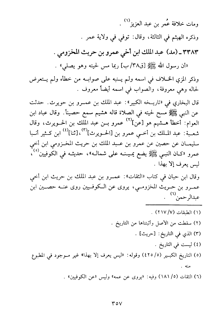 قال البخاري في " تاريخه الكبير ": عبد الملك بن عمرو بن حويرث. حدثت عن النبي - صلى الله عليه وسلم - مسح لحيته في الصلاة قاله هشيم سمع حصينا. وقال عباد ابن العوام: أخطأ هشيم هو [عن] عمرو بن عبد الملك بن الحويرث، وقال شعبة: عبد الملك بن أخي عمرو بن [الحويرث]، [ثنا] ابن كثير أنبا سليمان عن حصين عن عمرو بن عبد الملك بن حريث المخزومي ابن أخي عمرو " كان النبي - صلى الله عليه وسلم - يضع يمينه على شماله "، حديثه في الكوفيين، ليس يعرف إلا بهذا.