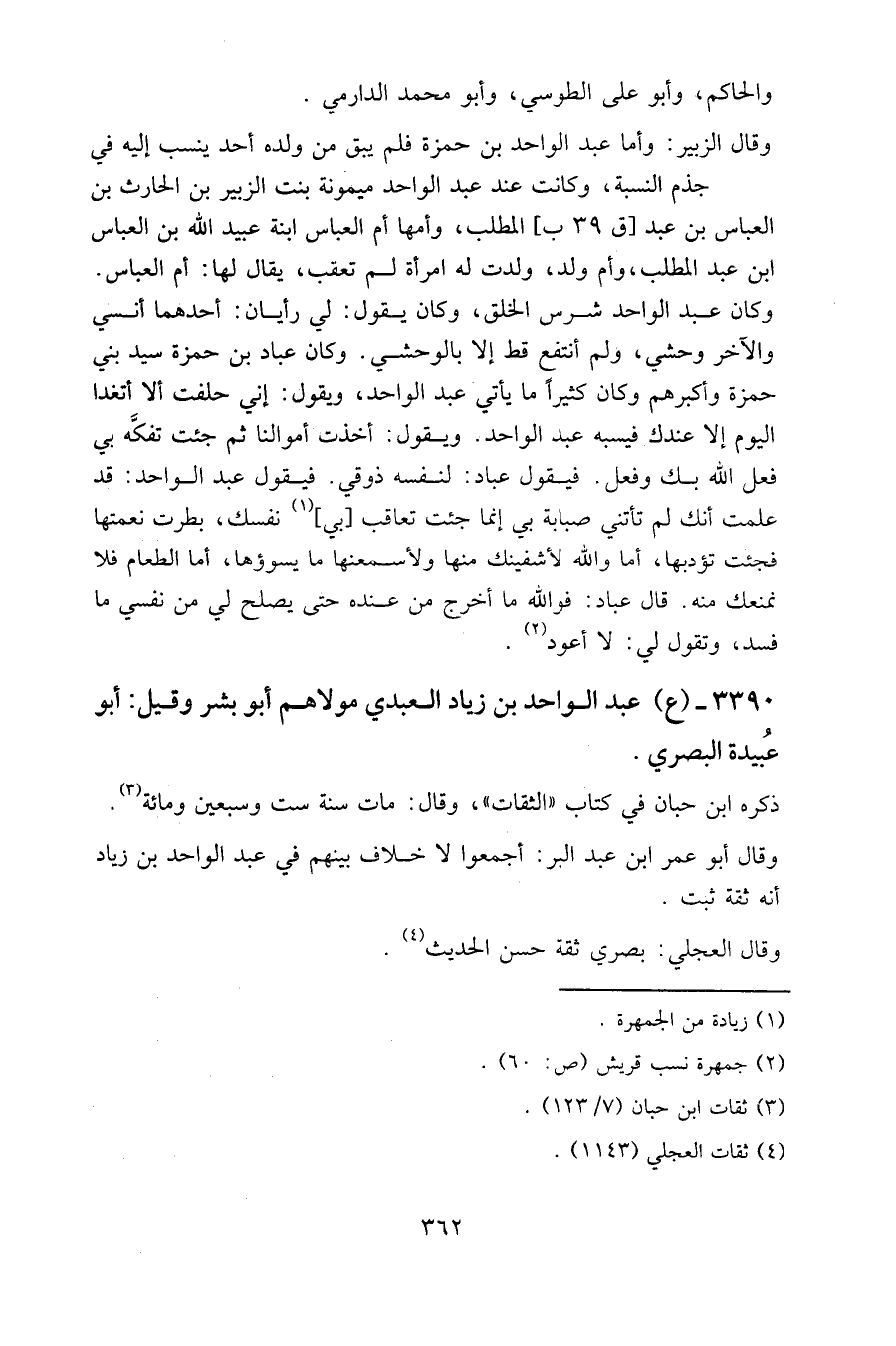 وقال الزبير: وأما عبد الواحد بن حمزة فلم يبق من ولده أحد ينسب إليه في جذم النسبة، وكانت عند عبد الواحد ميمونة بنت الزبير بن الحارث بن العباس بن عبد [ق39ب] المطلب، وأمها أم العباس ابنة عبيد الله بن العباس بن عبد المطلب، وأم ولد، ولدت له امرأة لم تعقب، يقال لها: أم العباس.