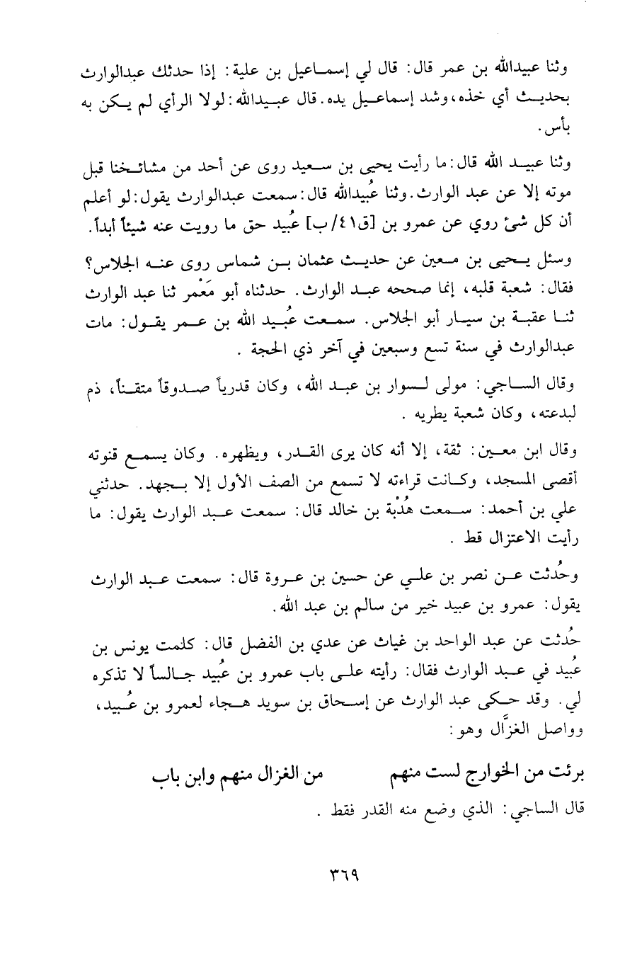 وثنا عبيد الله قال: ما رأيت يحيى بن سعيد روى عن أحد من مشائخنا قبل موته إلا عن عبد الوارث. وثنا عبيد الله قال: سمعت عبد الوارث يقول: لو أعلم أن كل شيء روي عن عمرو بن [ق41/ب] عبيد حق ما رويت عنه شيئا أبدا.