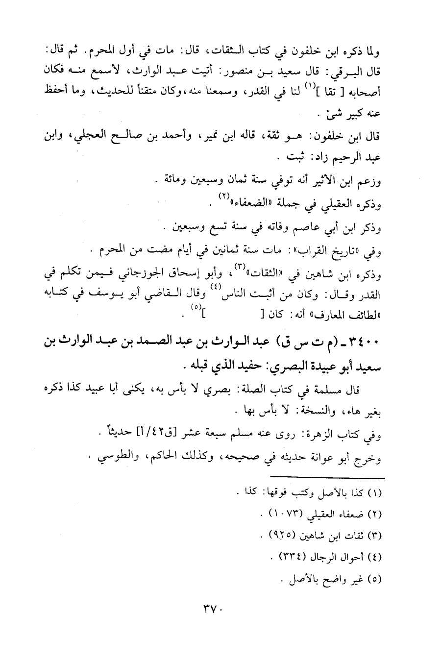 ولما ذكره ابن خلفون في كتاب الثقات، قال: مات في أول المحرم. ثم قال: قال البرقي: قال سعيد بن منصور: أتيت عبد الوارث، لأسمع منه فكان أصحابه [تقا] لنا في القدر، وسمعنا منه، وكان متقنا للحديث، وما أحفظ عنه كبير شيء.