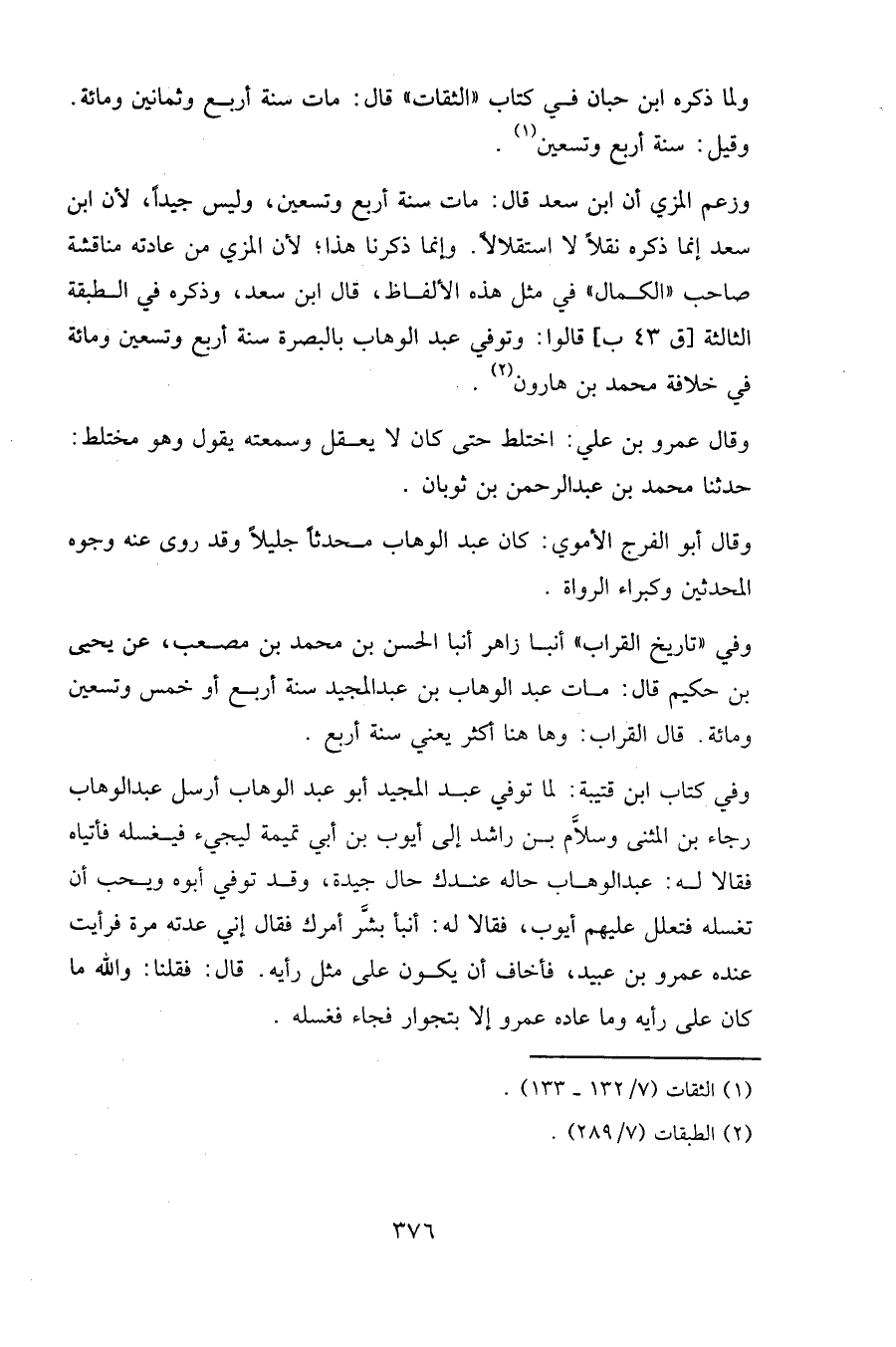 وزعم المزي أن ابن سعد قال: مات سنة أربع وتسعين، وليس جيدا، لأن ابن سعد إنما ذكره نقلا لا استقلالا. وإنما ذكرنا هذا؛ لأن المزي من عادته مناقشة صاحب " الكمال " في مثل هذه الألفاظ، قال ابن سعد، وذكره في الطبقة الثالثة [ق 43 ب] قالوا: وتوفي عبد الوهاب بالبصرة سنة أربع وتسعين ومائة في خلافة محمد بن هارون.