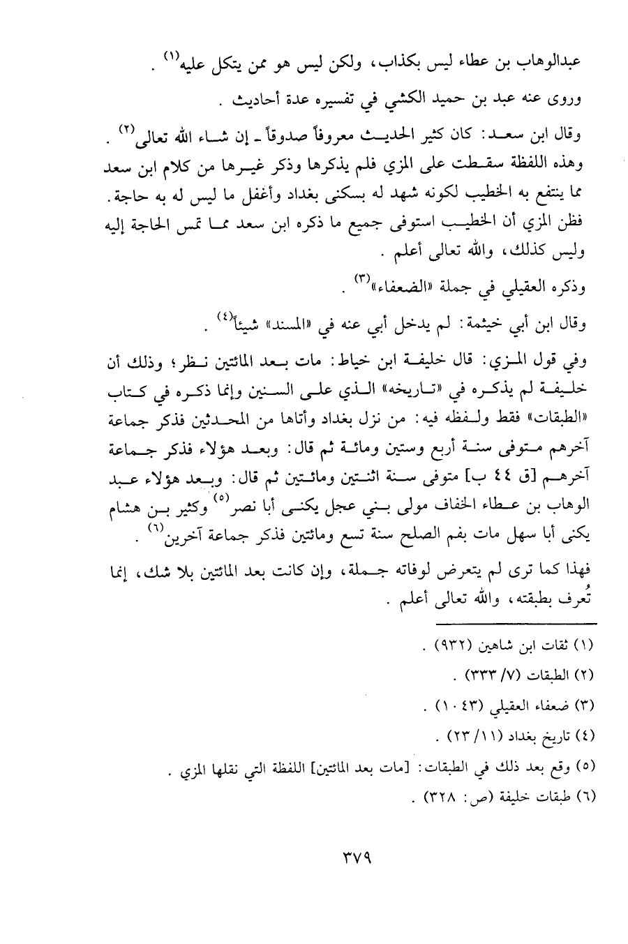 وفي قول المزي: قال خليفة ابن خياط: مات بعد المائتين نظر؛ وذلك أن خليفة لم يذكره في " تاريخه " الذي على السنين وإنما ذكره في كتاب " الطبقات " فقط ولفظه فيه: من نزل بغداد وأتاها من المحدثين فذكر جماعة آخرهم متوفى سنة أربع وستين ومائة ثم قال: وبعد هؤلاء فذكر جماعة آخرهم [ق44ب] متوفى سنة اثنتين ومائتين ثم قال: وبعد هؤلاء عبد الوهاب بن عطاء الخفاف مولى بني عجل يكنى أبا نصر وكثير بن هشام يكنى أبا سهل مات بفم الصلح سنة تسع ومائتين فذكر جماعة آخرين.