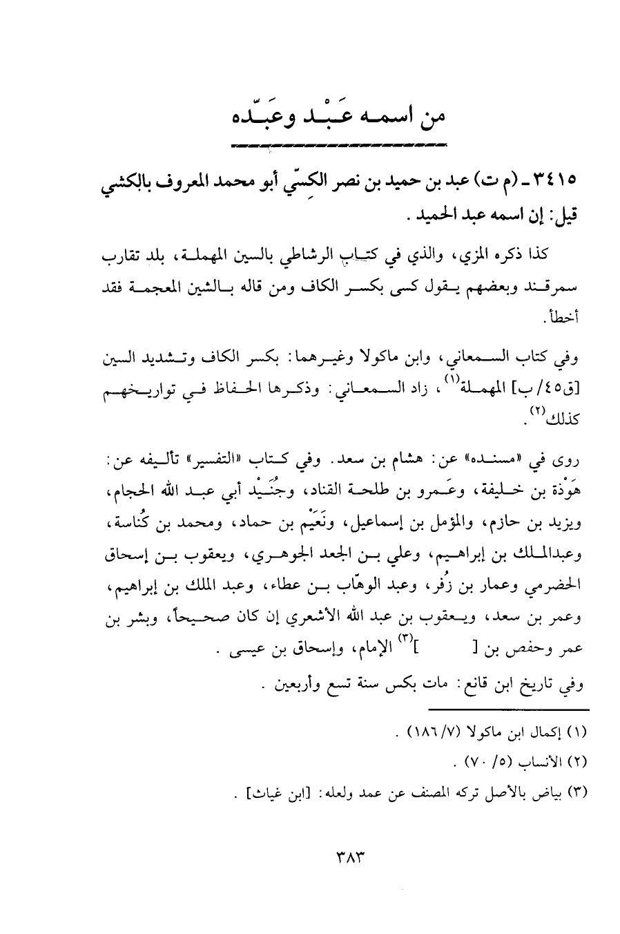 3415 - (م ت) عبد بن حميد بن نصر الكسي أبو محمد المعروف بالكشي قيل: إن اسمه عبد الحميد.
