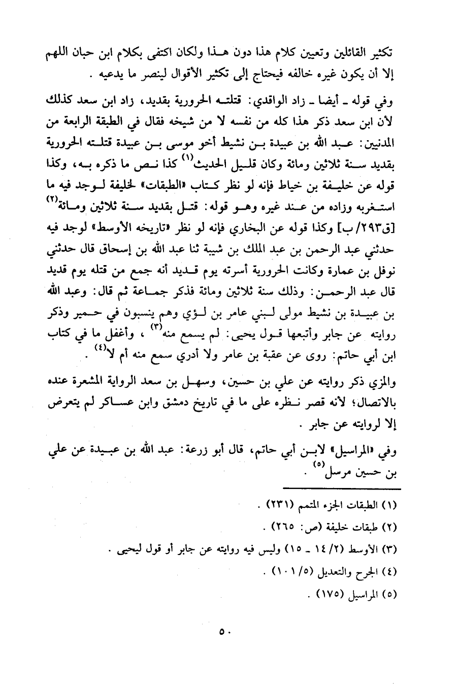 وفي قوله - أيضا - زاد الواقدي: قتلته الحرورية بقديد، زاد ابن سعد كذلك لأن ابن سعد ذكر هذا كله من نفسه لا من شيخه فقال في الطبقة الرابعة من المدنيين: عبد الله بن عبيدة بن نشيط أخو موسى بن عبيدة قتلته الحرورية بقديد سنة ثلاثين ومائة وكان قليل الحديث كذا نص ما ذكره به، وكذا قوله عن خليفة بن خياط فإنه لو نظر كتاب " الطبقات " لخليفة لوجد فيه ما استغربه وزاده من عند غيره وهو قوله: قتل بقديد سنة ثلاثين ومائة [ق293/ب] وكذا قوله عن البخاري فإنه لو نظر " تاريخه الأوسط " لوجد فيه حدثني عبد الرحمن بن عبد الملك بن شيبة ثنا عبد الله بن إسحاق قال حدثني نوفل بن عمارة وكانت الحرورية أسرته يوم قديد أنه جمع من قتله يوم قديد قال عبد الرحمن: وذلك سنة ثلاثين ومائة فذكر جماعة ثم قال: وعبد الله بن عبيدة بن نشيط مولى لبني عامر بن لؤي وهم ينسبون في حمير وذكر روايته عن جابر وأتبعها قول يحيى: لم يسمع منه، وأغفل ما في كتاب ابن أبي حاتم: روى عن عقبة بن عامر ولا أدري سمع منه أم لا.