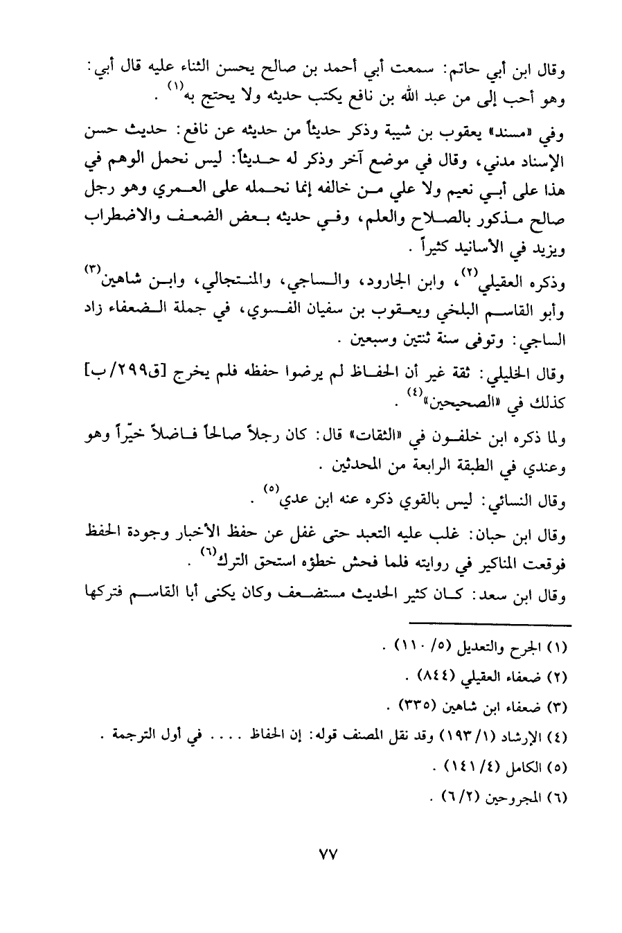 وقال ابن أبي حاتم: سمعت أبي أحمد بن صالح يحسن الثناء عليه قال أبي: وهو أحب إلي من عبد الله بن نافع يكتب حديثه ولا يحتج به.