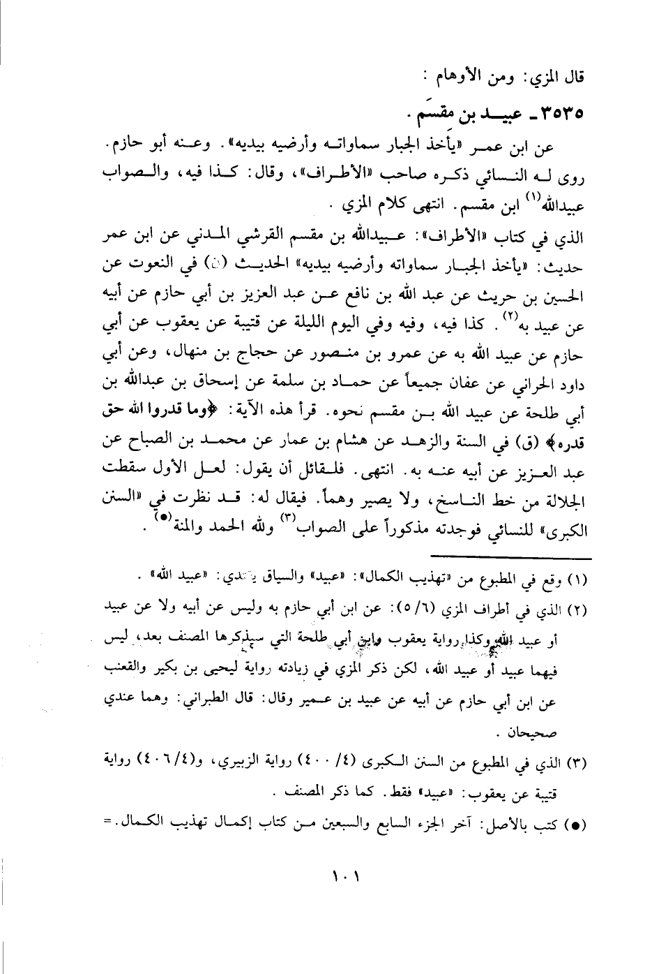 الذي في كتاب " الأطراف ": عبيد الله بن مقسم القرشي المدني عن ابن عمر حديث: " يأخذ الجبار سماواته وأرضيه بيديه " الحديث (ن) في النعوت عن الحسين بن حريث، عن عبد الله بن نافع، عن عبد العزيز بن أبي حازم، عن أبيه، عن عبيد به. كذا فيه، وفيه وفي اليوم الليلة عن قتيبة عن يعقوب عن أبي حازم عن عبيد الله به عن عمرو بن منصور عن حجاج بن منهال، وعن أبي داود الحراني، عن عفان، جميعا عن حماد بن سلمة، عن إسحاق بن عبد الله بن أبي طلحة، عن عبيد الله بن مقسم، نحوه. قرأ هذه الآية: {وما قدروا الله حق قدره} (ق) في السنة والزهد عن هشام بن عمار عن محمد بن الصباح عن عبد العزيز عن أبيه، عنه، به. انتهى. فلقائل أن يقول: لعل الأول سقطت الجلالة من خط الناسخ، ولا يصير وهما. فيقال له: قد نظرت في " السنن الكبرى " للنسائي فوجدته مذكورا على الصواب ولله الحمد والمنة.