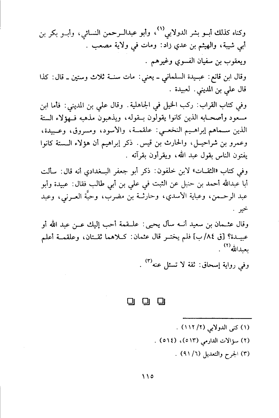 وقال عثمان بن سعيد أنه سأل يحيى: علقمة أحب إليك عن عبد الله أو عبيدة؟ [ق 84 / ب] فلم يختر قال عثمان: كلاهما ثقتان، وعلقمة أعلم بعبد الله.